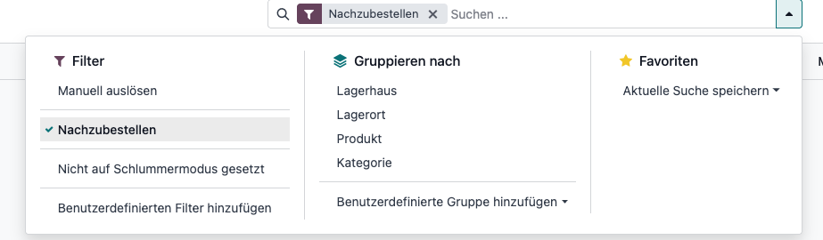 - In Odoo > Lager > Vorgänge > Beschaffung > Auffüllung
